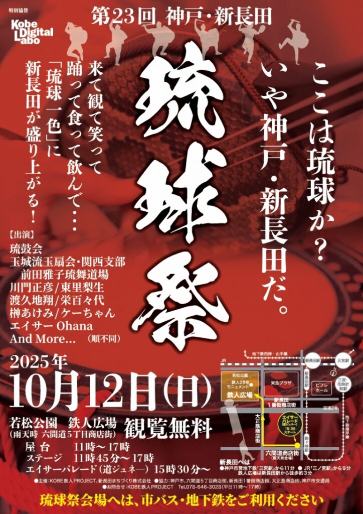 10/12 第23回 琉球祭 2025-09-18 最終更新日時 : 2025-09-27 管理人 鉄人広場をメイン会場に、アーケード商店街でエイサーパレードもあります。 情報元:新長田まちづくり株式会社主催:KOBE鉄人PROJECT