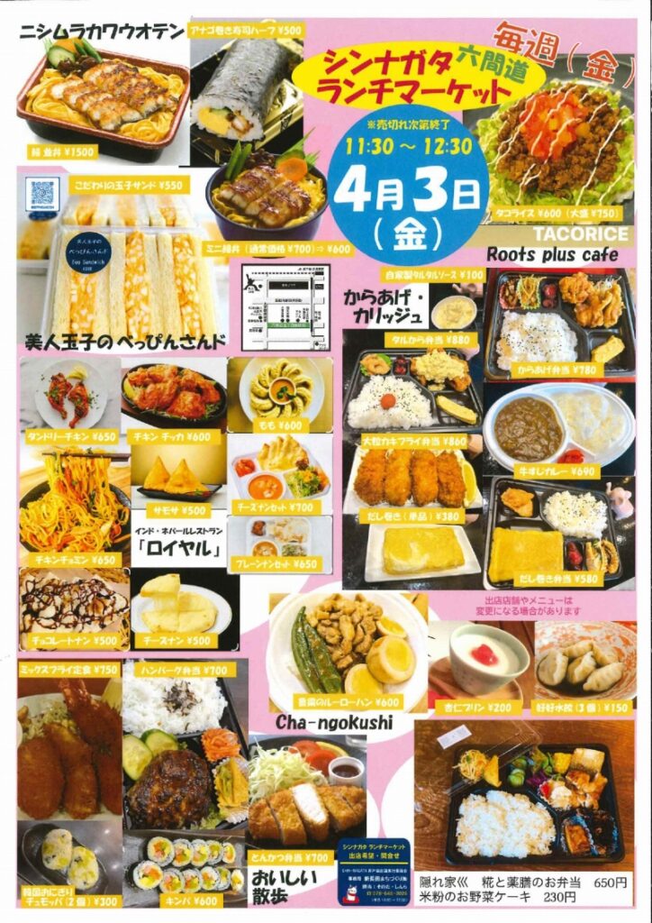 4/3,10,17,24 シンナガタ ランチマーケット 2026-04-01 最終更新日時 : 2026-04-01 管理人 美味しそうなランチがいっぱい!6月まで毎週やってるんだって。 情報元・主催:新長田まちづくり株式会社
