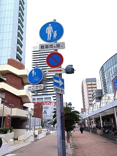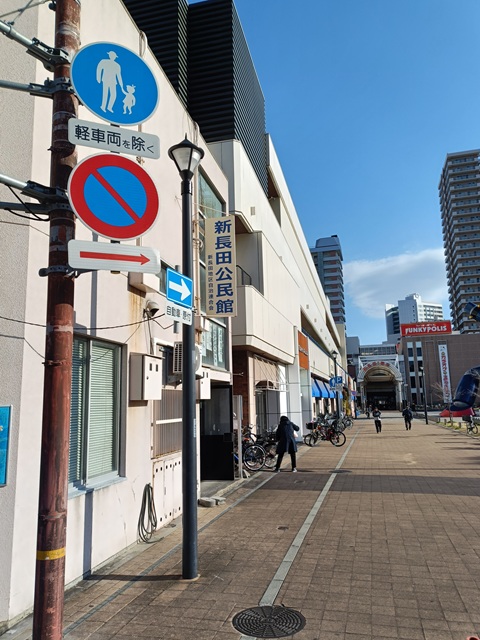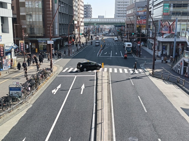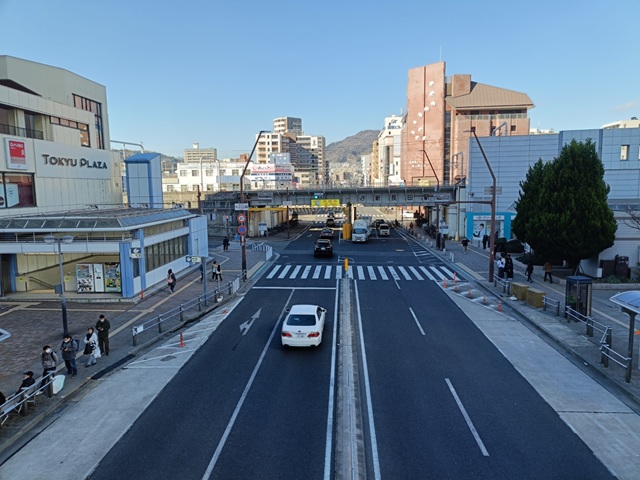 ここからJR新長田駅へ向かう場合、東急プラザの中を抜けていくと2Fのまま陸橋で駅前広場まで渡れるので、信号待ちは不要。