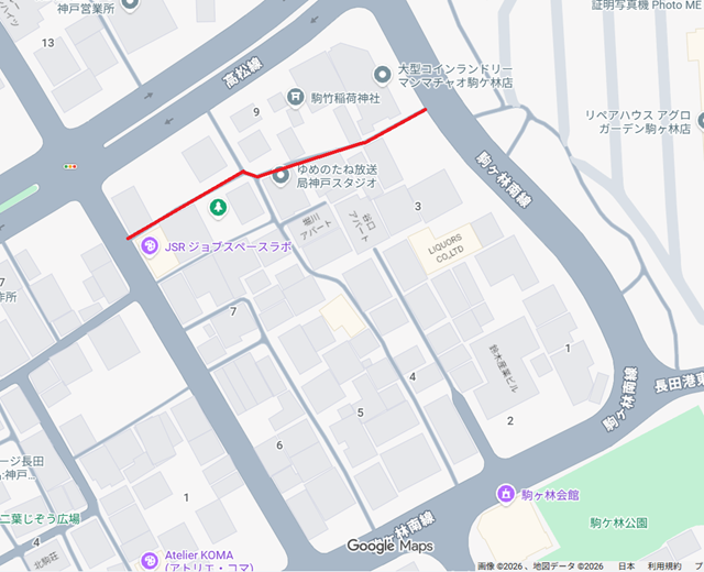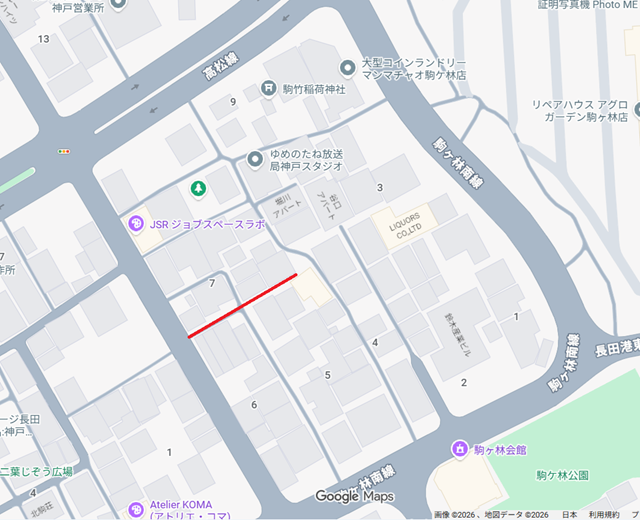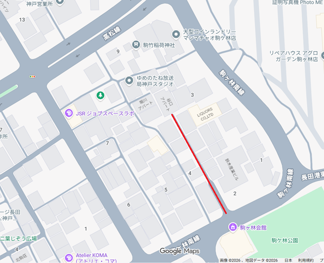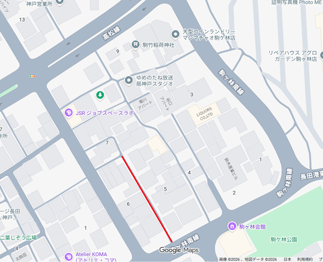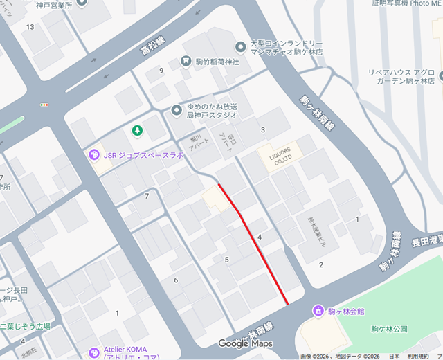 JR新長田駅から少し離れてるが、駒ヶ林1丁目(駒一)の南地区に○○小路と名前が付けられてる路地が6本ある。