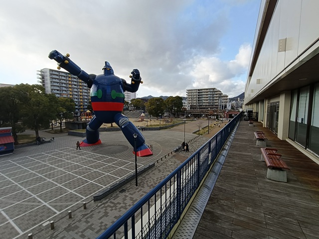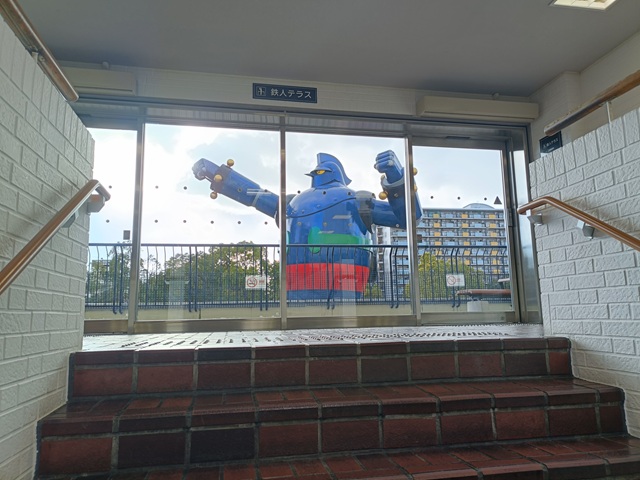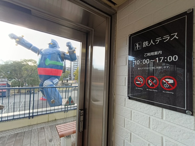 隣にある東急プラザの2階テラスから鉄人28号を見下ろすことができるよ。