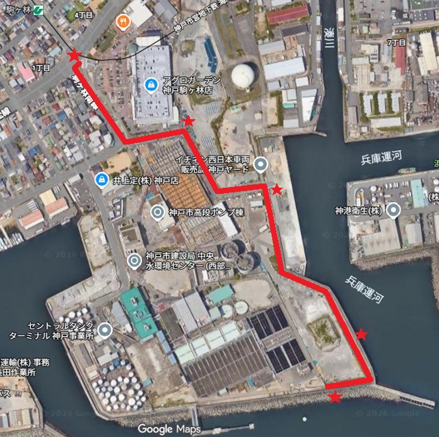地下鉄海岸線の駒ヶ林駅から地下道を通ってアグロガーデン側の地上に出たところが始点で、終点まで約900mの道のり。