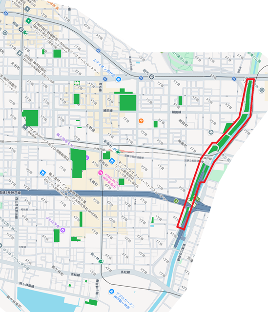 主要道や線路で数か所途切れるが、各区域毎に「新湊川公園」の表示がある。