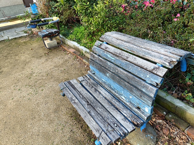 ベンチは傷んでいて、座るのに若干勇気が要る。